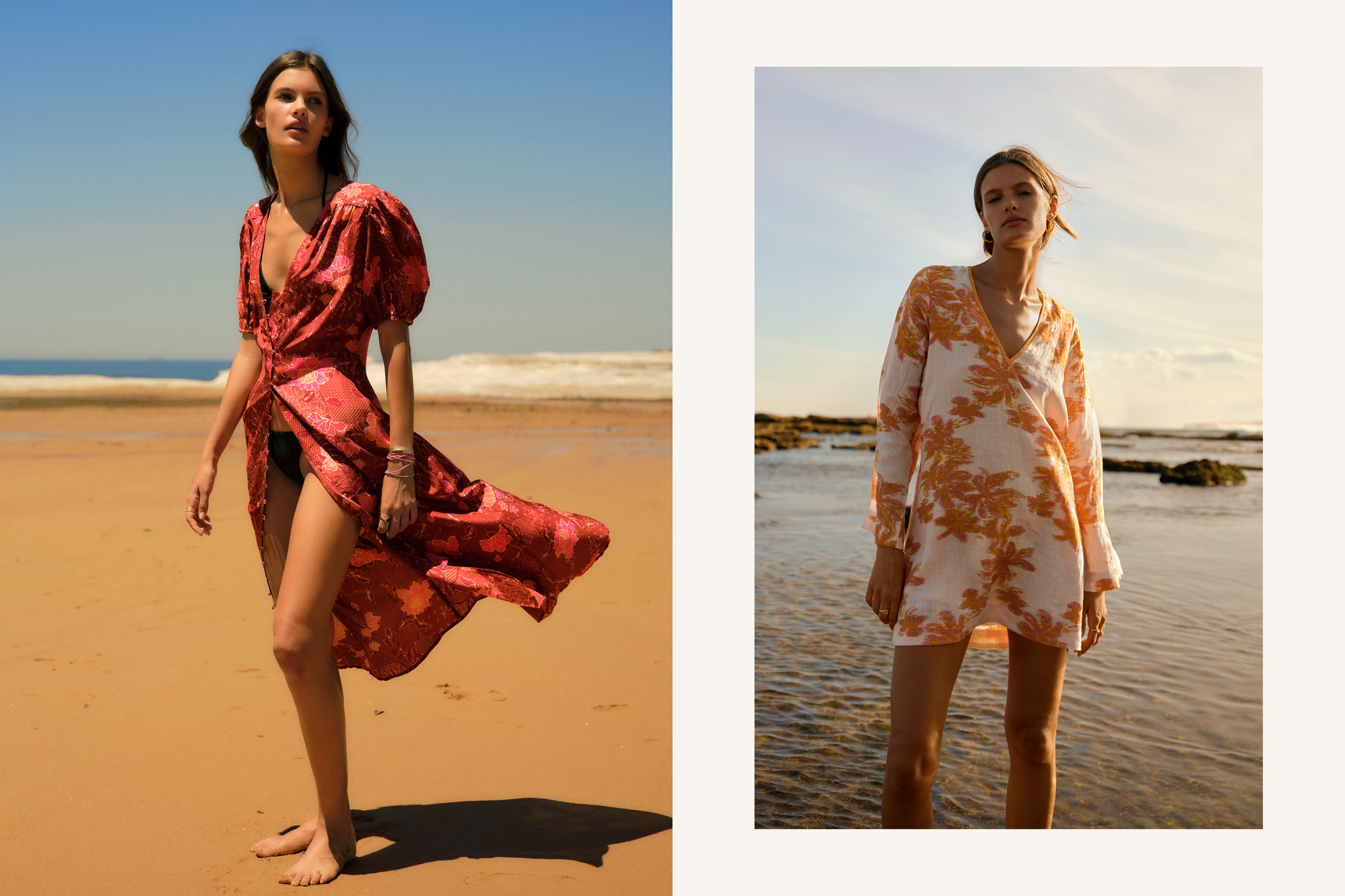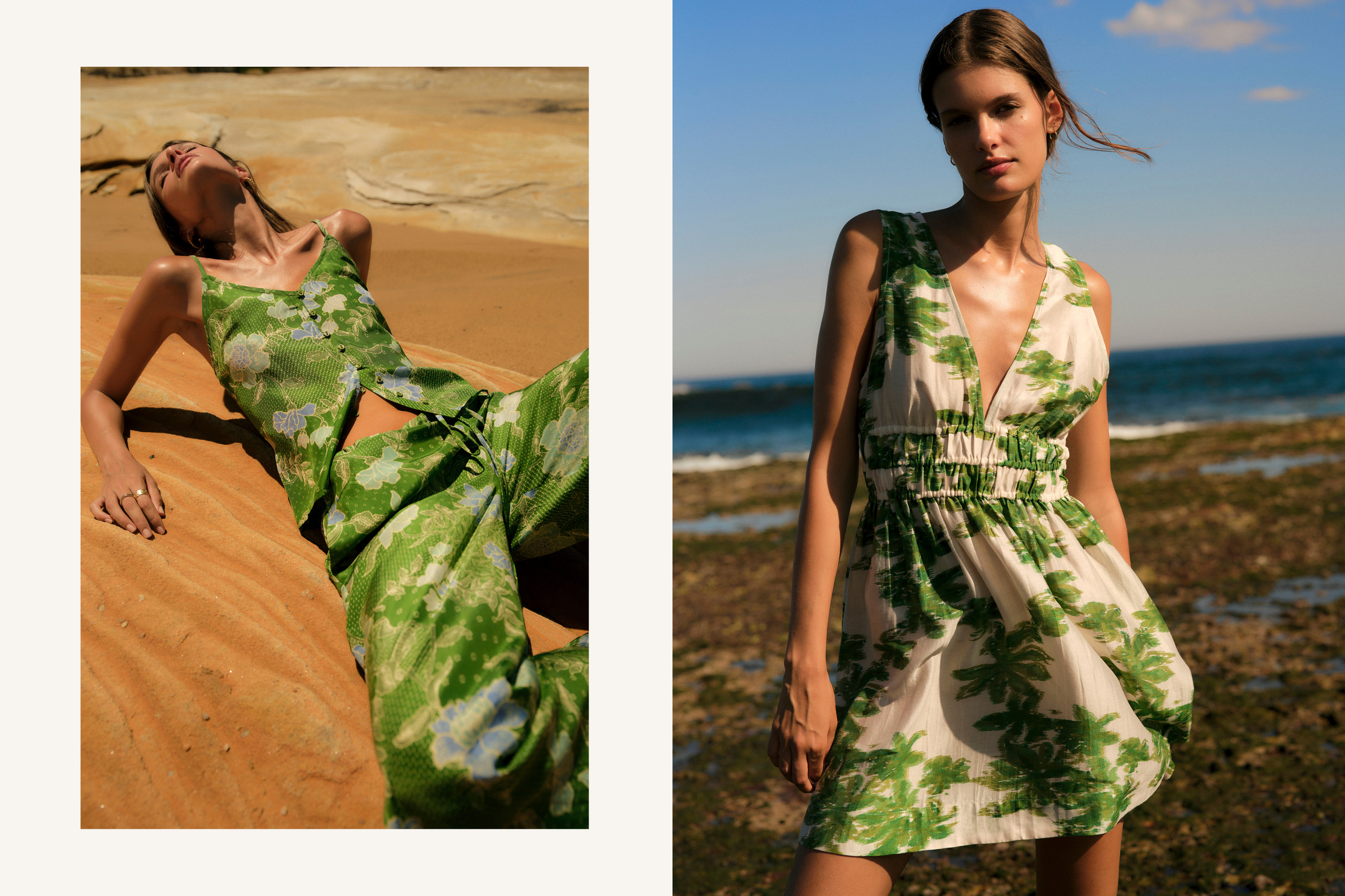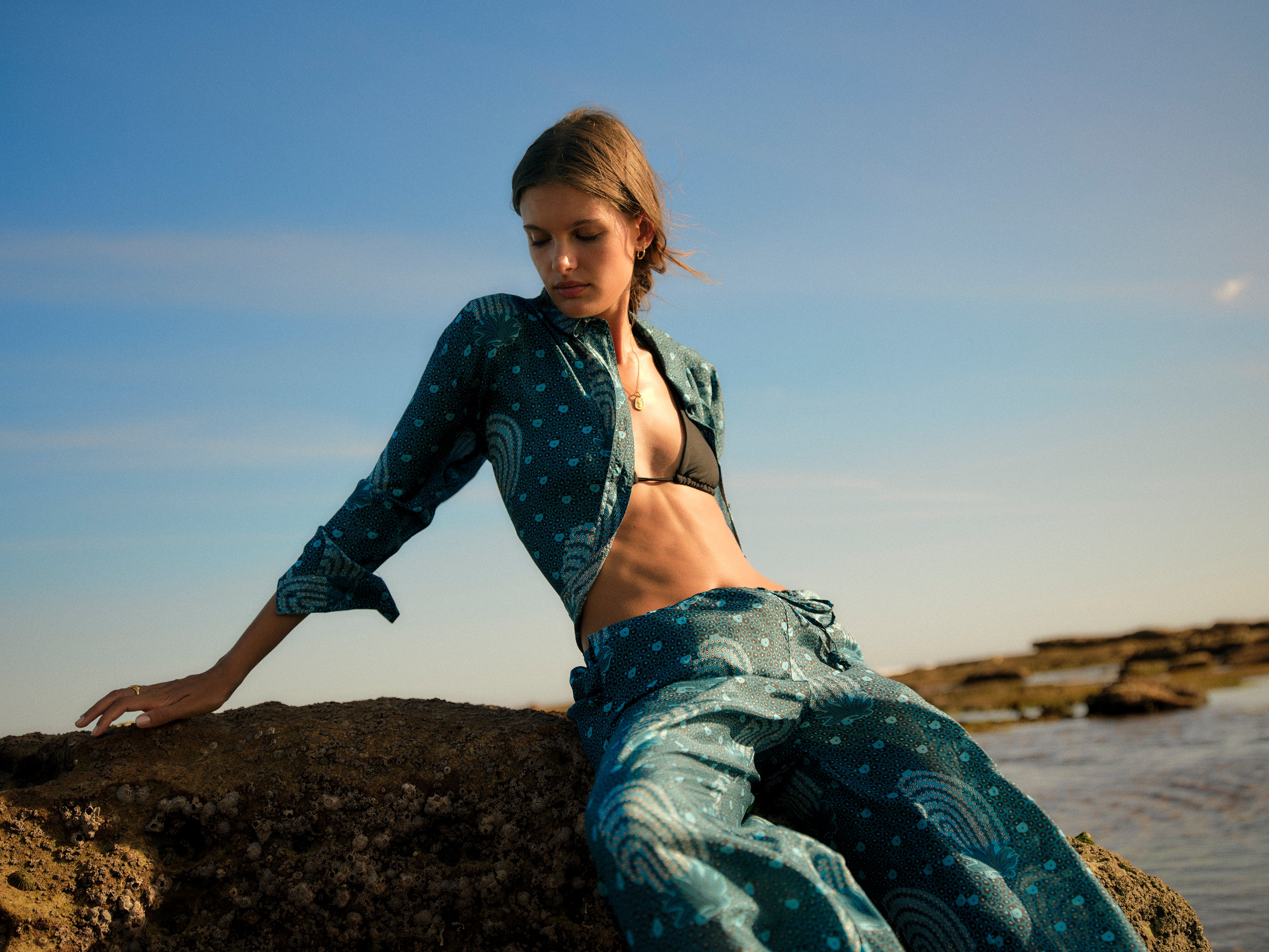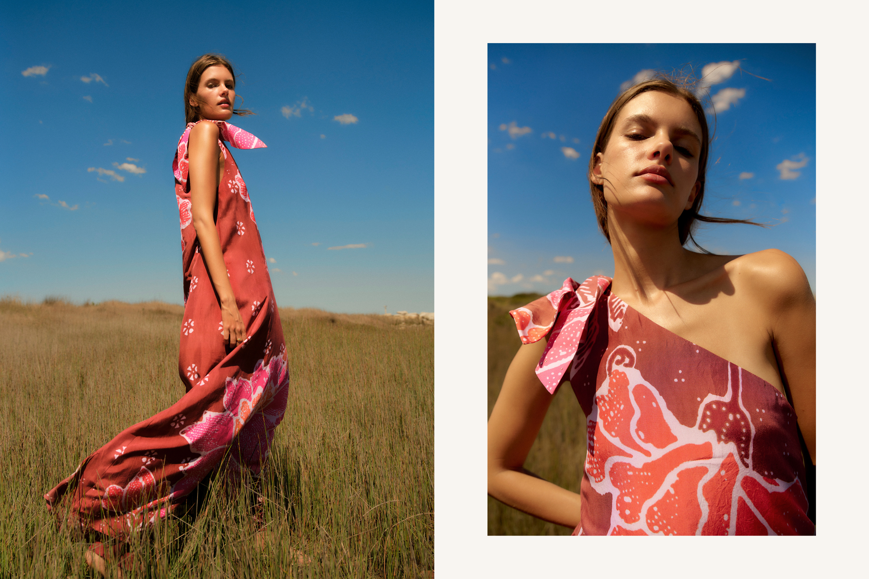 Hannah’s artworks of jungle vines, tropical fruits, flowers, and hand drawn ikats reflect the earthly connection between artist and nature. The colours of the island reach across the fabric, teasing at memories of discovery and inspiration. Continuing to deliver silhouettes that speak to the core of the brand was key in allowing the artworks and colours the opportunity to speak to the beauty of the wild.