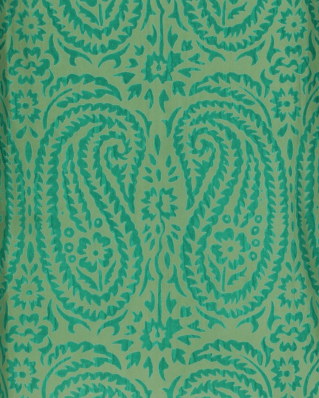 Green Paisley features ornate paisley motifs intertwined with floral elements, a classic pairing in Indian textile tradition. The detailed layout flows rhythmically across the fabric in tonal shades of emerald, creating texture and depth through pattern alone. With its balance of symmetry and movement, this print offers a timeless elegance rooted in craft and cultural heritage.