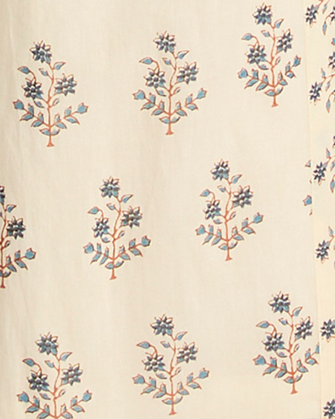 A traditional Indian Buta Print, Palma has a light and casual feel to it. Hand block printed by artisans in India, the Buta is the name for the Individual floral motif seen throughout the artwork. It is made up of a vine, flowers, buds and leaves, and can be seen throught India not only on fabrics but also architecture. The Palma Print also has a matching border print that is edge with a band of block colour to frame a detail within each garment.