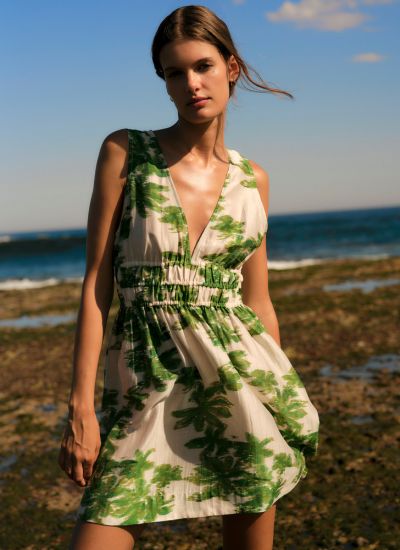 - Short sleeve mini dress with stand collar and centre front split