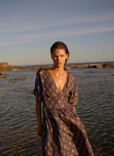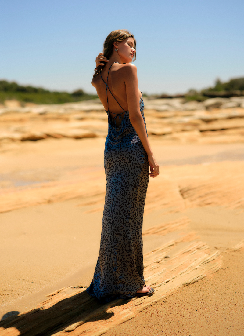 Exclusively hand-drawn for Hannah Artwear, the Magnolia Blue print features fluid brushwork in tonal shades of sky and teal, scattered with soft white blooms. Inspired by vintage botanical studies, this artwork celebrates natural form and movement. The print has been thoughtfully placed to enhance the silhouette, bringing a sense of freshness and coastal elegance to the collection.