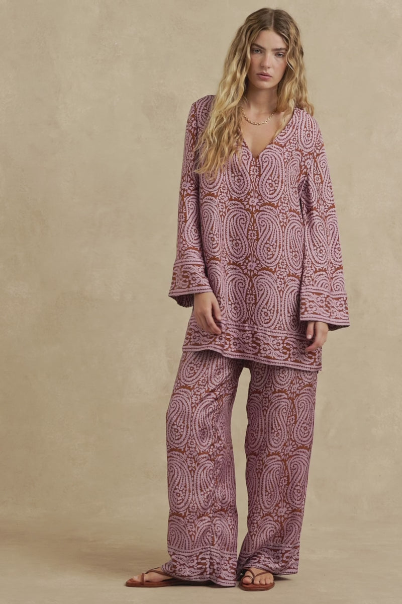 Paisley in Woodblock Purple is a celebration of traditional Indian textile design, featuring ornate paisley motifs framed by delicate florals. Inspired by heritage woodblock techniques, the print appears as if pressed by hand, with soft edges and rhythmic detail. The lilac-toned pattern sits against a warm spice ground, offering a playful yet grounded interpretation of a timeless classic.