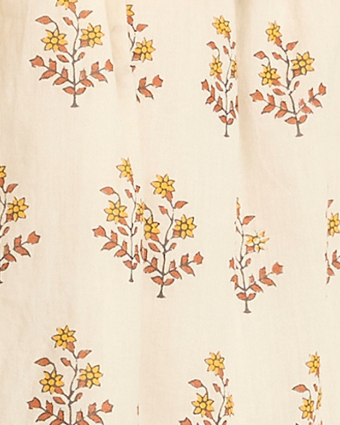 A traditional Indian Buta Print, Palma has a light and casual feel to it. Hand block printed by artisans in India, the Buta is the name for the Individual floral motif seen throughout the artwork. It is made up of a vine, flowers, buds and leaves, and can be seen throughout India not only on fabrics but also architecture. The Palma Print also has a matching border print that is edge with a band of block colour to frame a detail within each garment.