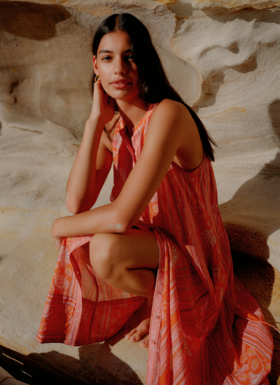 Set against a deep, earthy burgundy base, this iteration of the Bloom print brings warmth and richness to the hand drawn vine floral. Soft pink and tangerine blossoms are layered with delicate resist-inspired details, evoking the traditional dyeing techniques of Indonesia and India. The result is bold and intricate, with a nostalgic energy that anchors the print in heritage.